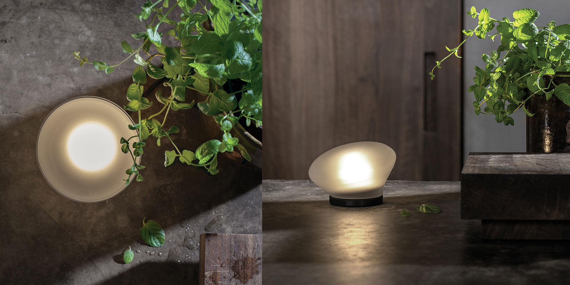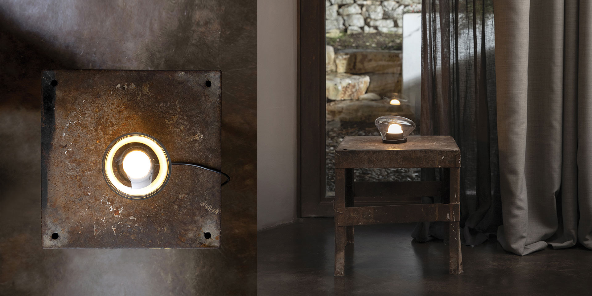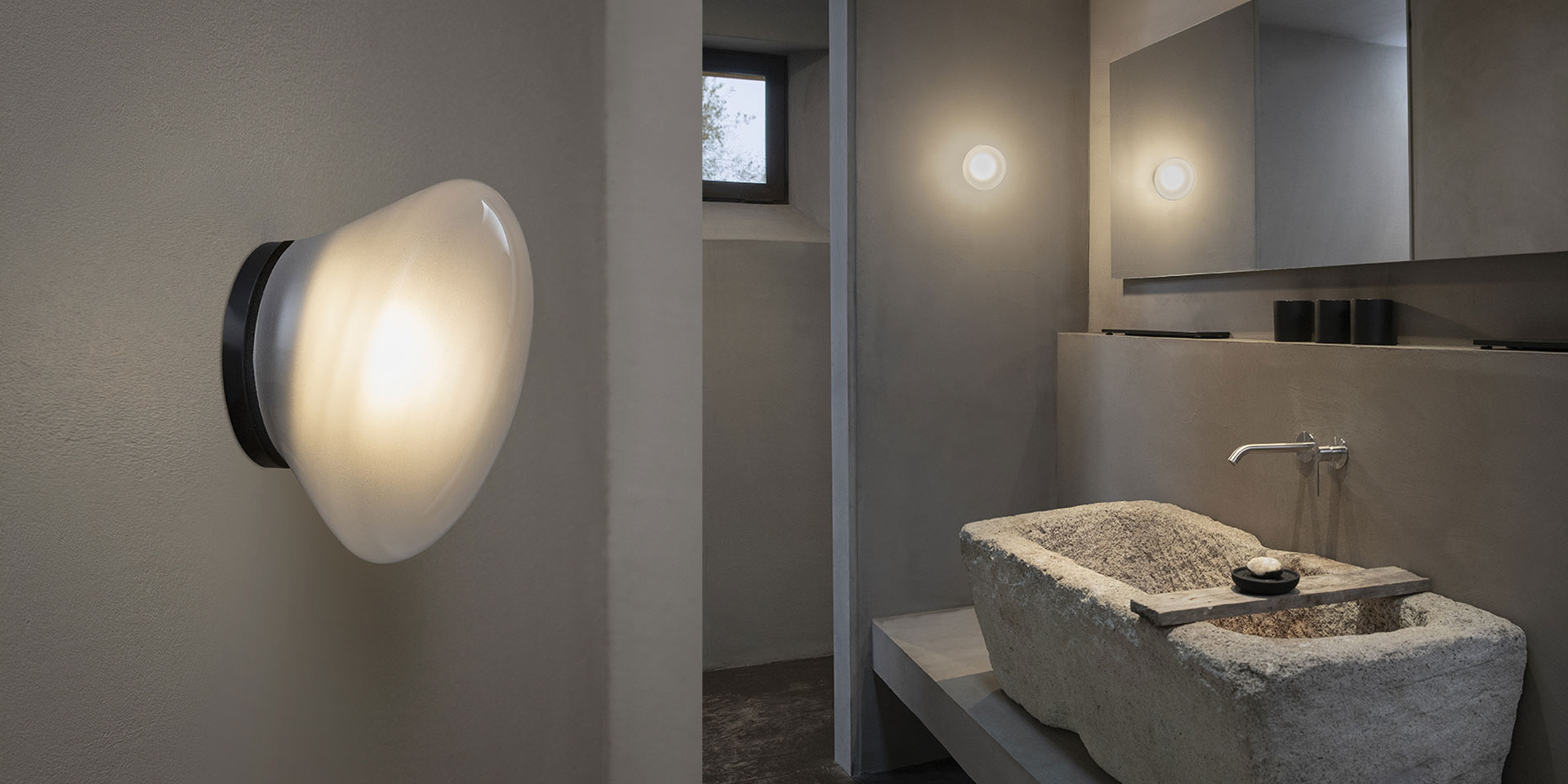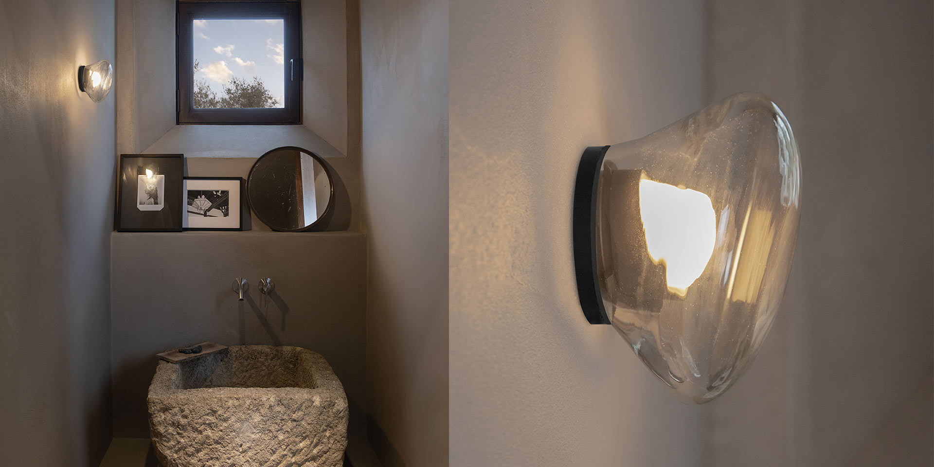 A circular shaped, mouthblown, thick glass spot, transparent or satin-finished. Agua can be used as a table or wall lamp to createa a halo on a wall or other reflective surface. The base is in black anodized aluminum with an internal cap diffuser to protect the LED light source. It can be placed in geometric or random patterns, as a one-point light on a side table, or in a hidden corner of the house or garden.