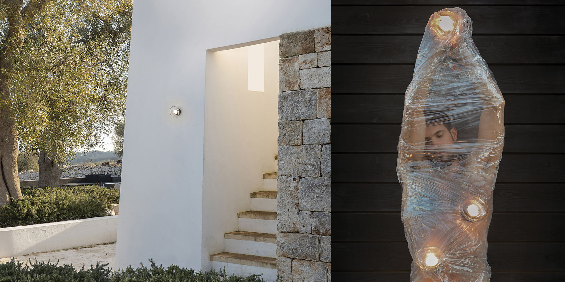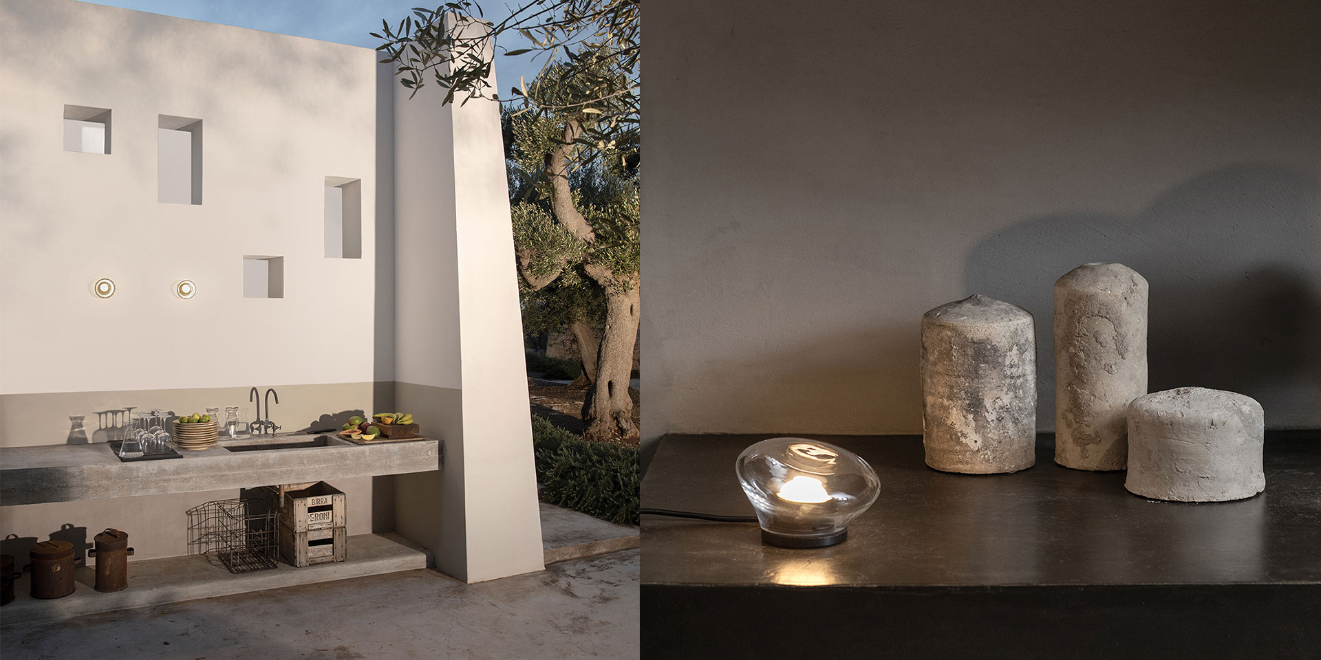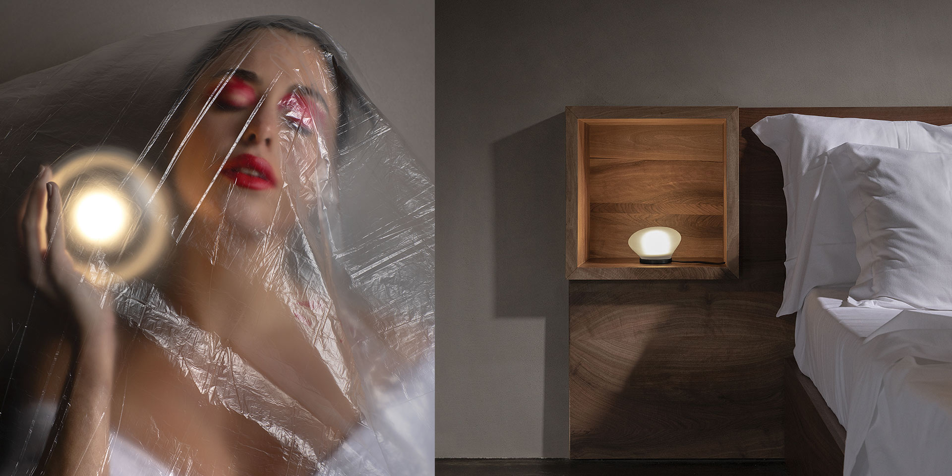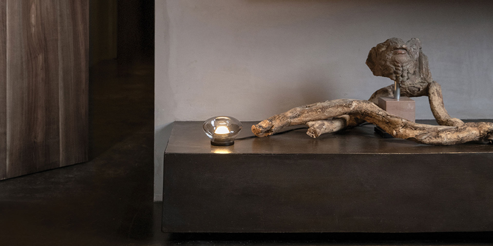 A circular shaped, mouthblown, thick glass spot, transparent or satin-finished. Agua can be used as a table or wall lamp to createa a halo on a wall or other reflective surface. The base is in black anodized aluminum with an internal cap diffuser to protect the LED light source. It can be placed in geometric or random patterns, as a one-point light on a side table, or in a hidden corner of the house or garden.