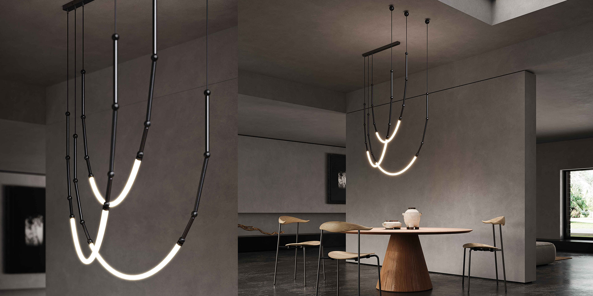 Like precious jewels adorning a woman’s neck, these modular and flexible light elements decorates the room. The lamps in this collection alternate between cylindrical bars and small spheres of anodized bronze or black aluminum, arranged like pearls in a ring on a wire supporting LEDs encased in a transparent, flexible silicone tube. Customizable to the space to be illuminated, Leda is a cohesive and decorative chain that surrounds a universal symbol and alludes to the charming idea of the circle as a symbol of elegance and beauty. Installable in any direction, Leda can be used indoors or outdoors as a suspension, floor lamp, or system lighting to decorate and illuminate elegant rooms, porches, gardens and terraces. The small metal loop also allow for flexible layout and shape changes.
